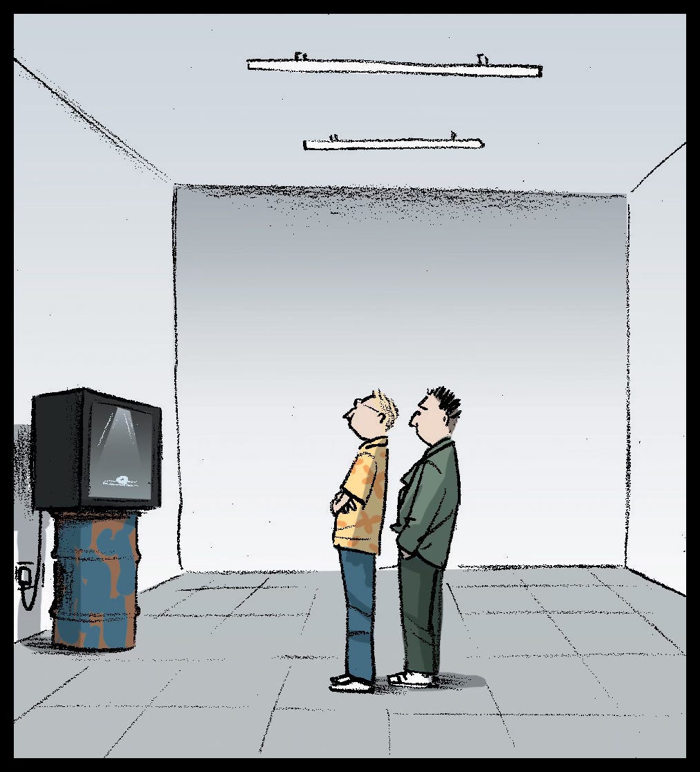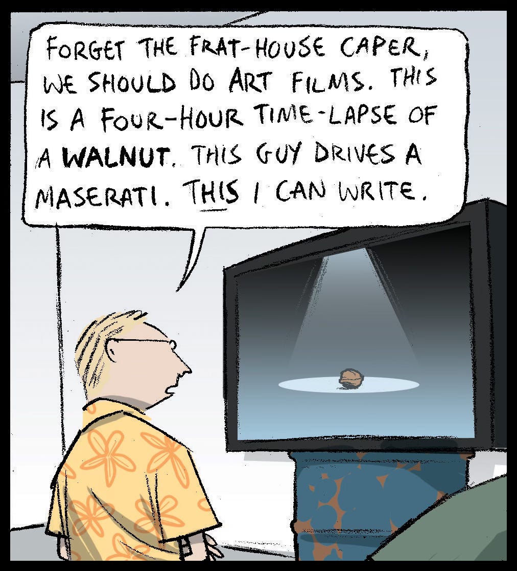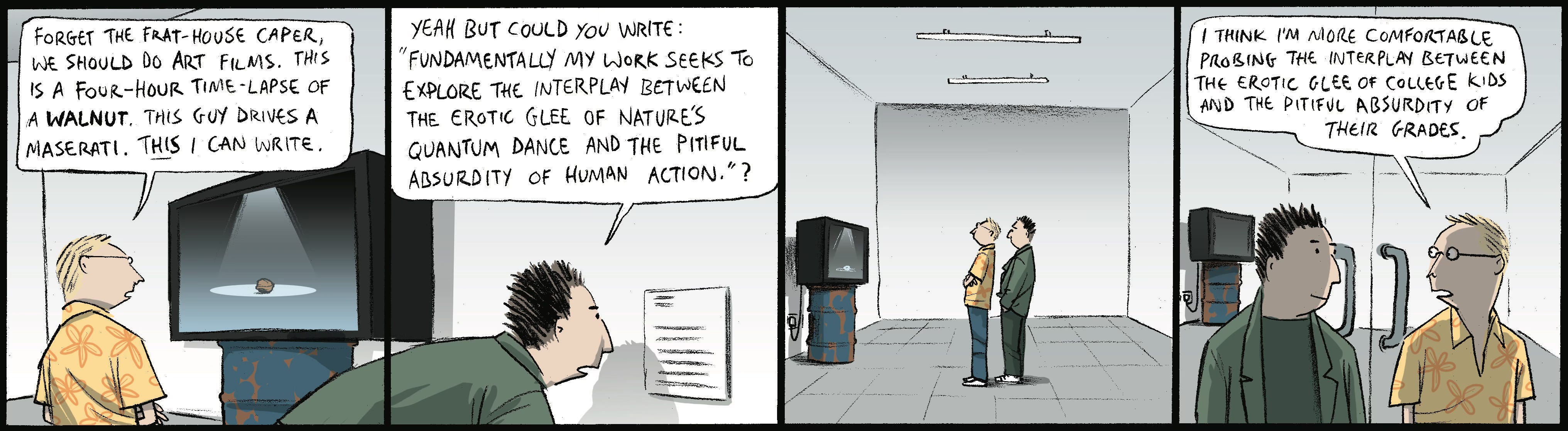 And years before that, we had a weekly four panel strip in the Film and Music section of The Guardian, The Pitchers, that ran from 2003-2009. Chet and Foley were our Hollywood hopeless screenwriters, here enjoying some high art.