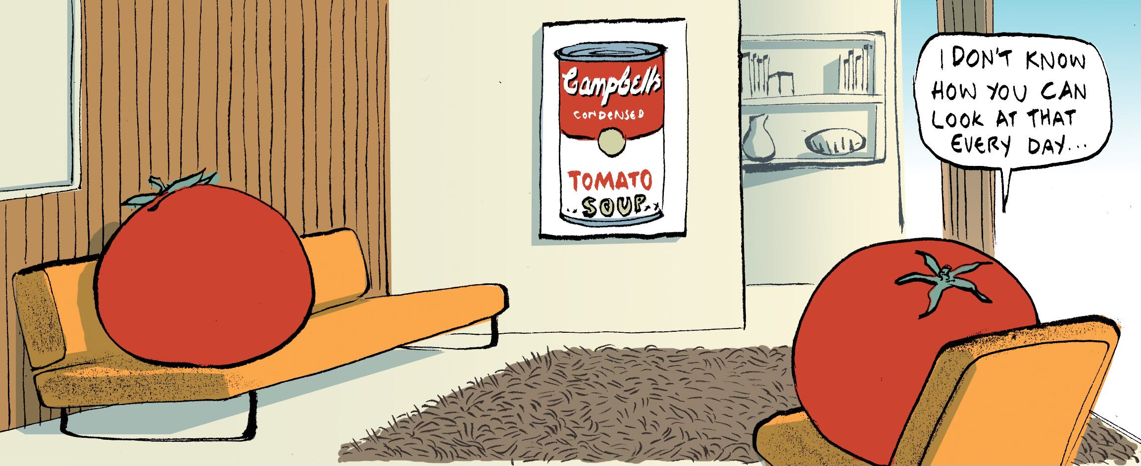 Years earlier, when our cartoon was on the food pages of the same, we often took as our inspiration the inner lives of fruit and vegetables. Is it too much of a stretch to imagine tomatoes might live in a cool apartment with Andy Warhol prints on the wall? Yes it probably is.